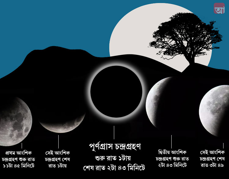 যার মানে, পূর্ণ আর আগে-পরের দু’-দু’টি আংশিক চন্দ্রগ্রহণ মিলে মোট ৩ ঘণ্টা ৫৪ মিনিট (১ ঘণ্টা ৪৩ মিনিট + ১ ঘণ্টা ৬ মিনিট + ১ ঘণ্টা ৬ মিনিট) আলো-আঁধারিতে ঢাকা থাকবে চাঁদ।