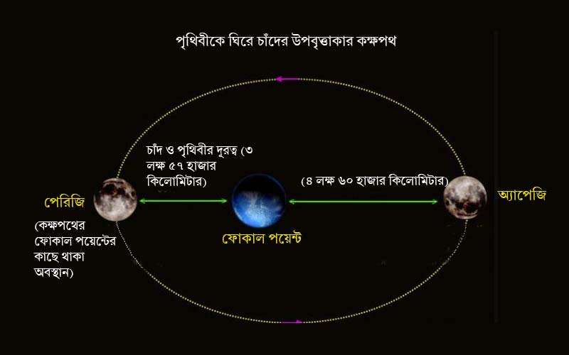 দেবীপ্রসাদবাবুর ব্যাখ্যা, পৃথিবীকে কেন্দ্র করে উপবৃত্তাকার (অনেকটা ডিমের মতো) কক্ষপথে পাক খায় চাঁদ। পৃথিবীকে এক বার পাক খেতে তার গড়ে সময় লাগে সাড়ে ২৭ দিন। আর যেহেতু চাঁদ অনেকটা ডিমের মতো কক্ষপথে পাক মারে পৃথিবীকে, তাই ওই সাড়ে ২৭ দিনের মধ্যে চাঁদ এক বার পৃথিবীর সবচেয়ে কাছে চলে আসে। আর তার পর এক বার সবচেয়ে দূরে চলে যায়।