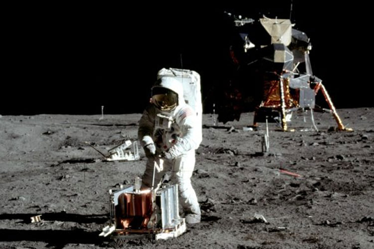 চাঁদের মাটিতে নেমে কাজে ব্যস্ত মার্কিন মহাকাশচারী বাজ অলড্রিন। ১৯৬৯ সালে।