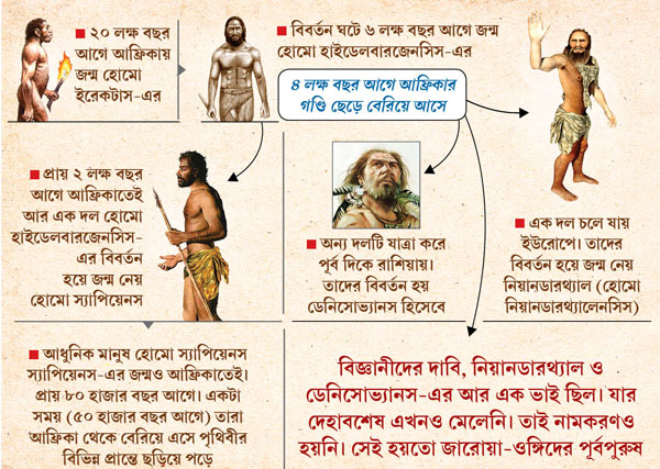 বিজ্ঞানের ইতিহাস বলে, প্রায় ২০ লক্ষ বছর আগে আফ্রিকায় জন্ম হোমো ইরেকটাস-এর। এদের বিবর্তন হয়ে জন্ম নেয় হোমো হাইডেলবারজেনসিস। এদের দেহাবশেষও পাওয়া গিয়েছিল। যা নিয়ে গবেষণা চালিয়ে পরবর্তী কালে জানা যায়, ৬ লক্ষ বছর আগে হোমো হাইডেলবারজেনসিস-এর ঘরবাড়ি ছিল আজকের ইথিওপিয়ায়। এর পর (অন্তত ৪ লক্ষ বছর আগে) আফ্রিকার গণ্ডি ছেড়ে বেরিয়ে আসে আদিম মানুষের (হোমো হাইডেলবারজেনসিস) একটি দল। ভাগ হয়ে যায় দু’টো স্রোতে। এক দল চলে যায় ইউরোপে। তাদের বিবর্তন হয়ে জন্ম হয় নিয়ানডারথ্যাল (হোমো নিয়ানডারথ্যালেনসিস)-এর। অন্য দলটি যাত্রা করে আফ্রিকা থেকে পূর্ব দিকে। তাদের বিবর্তন হয় ডেনিসোভ্যানস হিসেবে। বলা ভাল, এই ডেনিসোভ্যানস নামটা এসেছিল রাশিয়ার ডেনিসোভা গুহা থেকে। ওই গুহার মধ্যে বিবর্তিত মানুষের একটি আঙুলের হাড়ের জীবাশ্ম মেলে। অন্য দিকে, আফ্রিকায় থেকে যাওয়া হোমো হাইডেলবারজেনসিস মানুষেরও বিবর্তন ঘটে। সে প্রায় ২ লক্ষ বছর আগে। জন্ম নেয় হোমো স্যাপিয়েনস।
