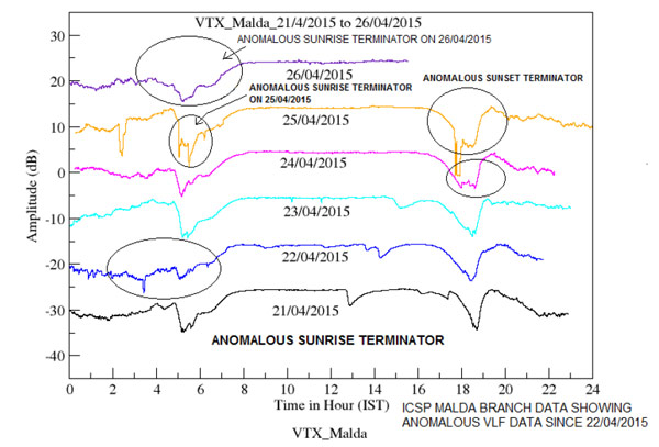 নেপালের ভূকম্পের তিন দিন আগে ধরা পড়ে যে বিশৃঙ্খলা। (গোলাকার দাগ)