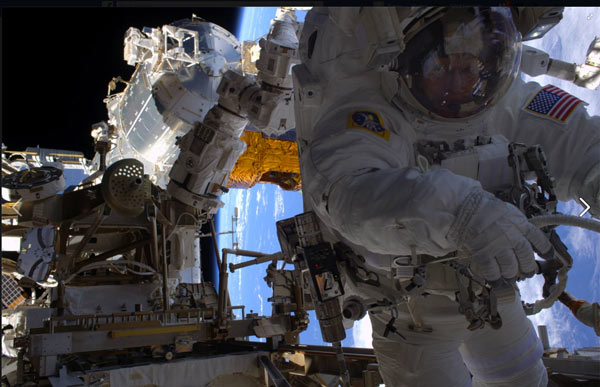 গত শুক্রবার রাতে মহাকাশে হাঁটতে বেরনোর আগে তোলা ছবি। সঙ্গী মহাকাশচারী শেন কিমব্রাও।