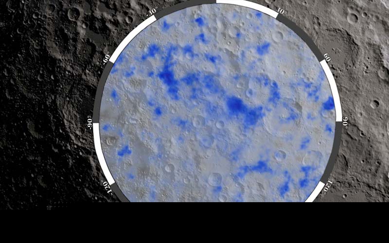চাঁদের পিঠে যেখানে যেখানে জলের হদিশ মিলেছে (নীল ছোপ)। ছবি- নাসা