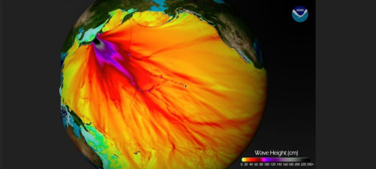 যে ভাবে প্রশান্ত মহাসাগর ধরে এগিয়েছিল (লাল দাগ) জাপানের ২০১১ সালের সুনামি
