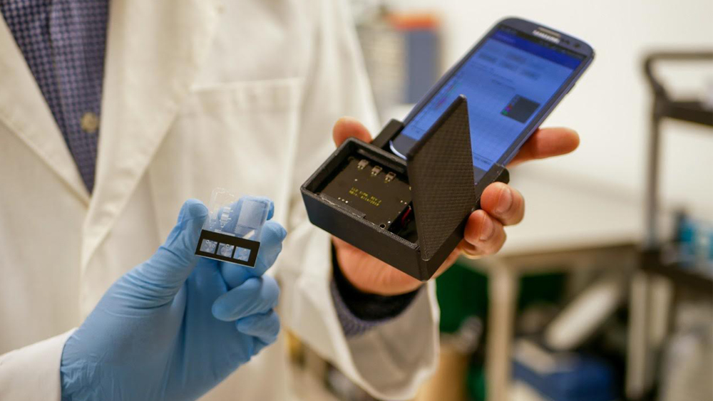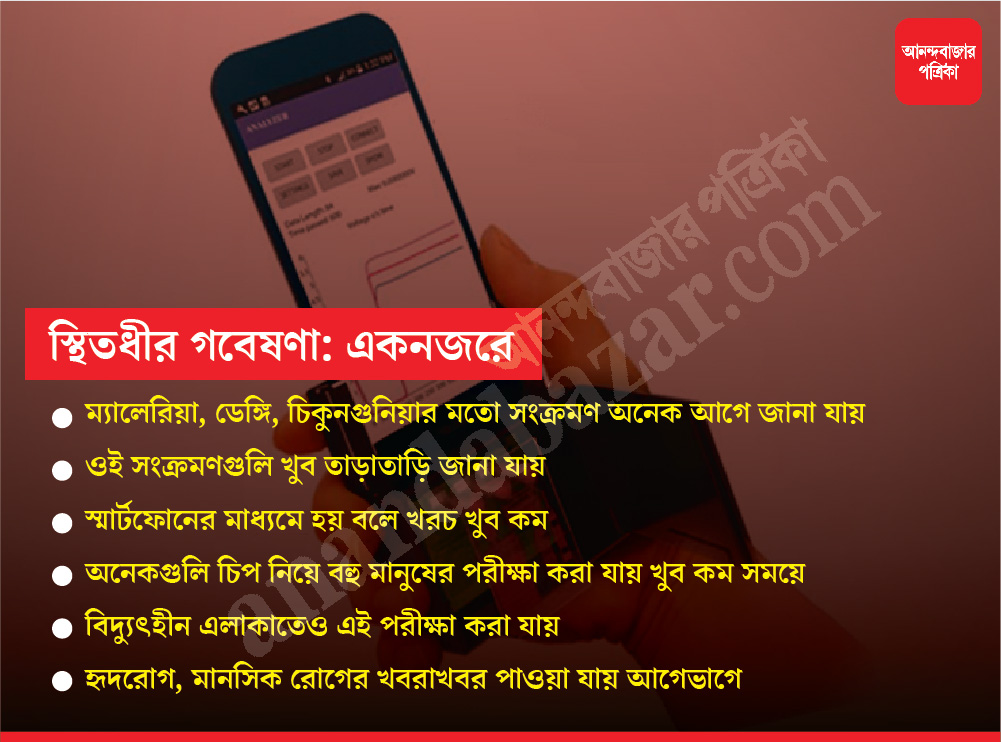 চিকিৎসক বা প্যাথলজিক্যাল ল্যাবরেটরিতে ছুটোছুটি না করে আমাদের হাতে প্রায় সব সময় থাকা মোবাইল ফোনে ঝট্ করে এই সব জেনে নেওয়ার নতুন পথ দেখালেন বেহালার বেচারাম চ্যাটার্জি রোডের বাসিন্দা স্থিতধী। স্মার্টফোনের সঙ্গে খুব পাতলা আর ছোট্ট একটা ‘চিপ’ জুড়ে। যা আদতে একটি ‘পোর্টেবল ল্যাবরেটরি’। বা ‘ল্যাব-অন-চিপ’।