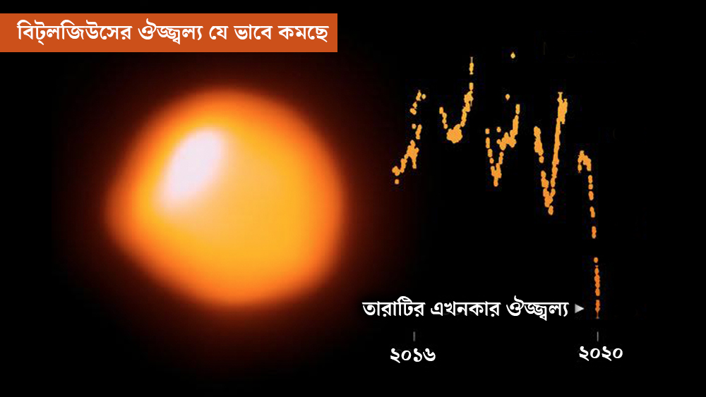কলকাতার ‘ইন্ডিয়ান সেন্টার ফর স্পেস ফিজিক্স (আইসিএসপি)’-এর অধিকর্তা সন্দীপ চক্রবর্তী ‘আনন্দবাজার ডিজিটাল’কে জানাচ্ছেন, আবিষ্কারের পর থেকে তারাটিকে এতটা অনুজ্জ্বল দেখা যায়নি আর কখনও। গত তিন মাসে (নভেম্বর, ডিসেম্বর ও জানুয়ারি) বিট্লজিউসের ঔজ্জ্বল্য কমে অর্ধেক হয়ে গিয়েছে। ফলে, শীতের মেঘমুক্ত আকাশেও আর তেমন চোখে পড়ছে না তারাটিকে। এই জানুয়ারিতে তার ঔজ্জ্বল্য আরও কমেছে। সামনের কয়েক মাসে তা আরও কমতে পারে।