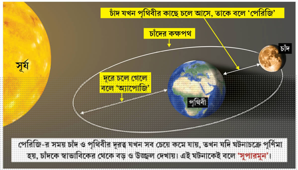 আবার কপাল কিছুটা মন্দও আমাদের! সেই উজ্জ্বলতম চাঁদের পূর্ণগ্রাস ‘গ্রহণ’ আমরা কলকাতায় আজ দেখতে পাইনি। তা দেখা যাবে শুধুই উত্তর আর মধ্য আমেরিকা, আফ্রিকা আর দক্ষিণ ও পশ্চিম এশিয়ার কয়েকটি দেশে। ভারতের কোথাওই দেখা যাবে না ‘পূর্ণগ্রাস চন্দ্রগ্রহণ’। পৃথিবীর চার দিকে তার একমাত্র উপগ্রহ- চাঁদ চক্কর মারছে দিন-রাত। কিন্তু, যে-পথে চক্কর মারছে, সেই পথটা আসলে পুরোপুরি গোলাকার নয়। বরং অনেকটা ডিমের মতো। ফলে, চক্কর মারতে-মারতে সেই চাঁদ কখনও আমাদের এই গ্রহের কাছে চলে আসে, কখনও-বা চলে য়ায় দূরে। চাঁদকে সবচেয়ে বড় দেখতে লাগে তখনই, যখন সেটি সবচেয়ে কাছে চলে আসে পৃথিবীর। যাকে জ্যোতির্বিজ্ঞানের পরিভাষায় বলে, ‘পেরিজি’। সবচেয়ে কাছে আসে বলেই চাঁদকে দেখতে তখন সবচেয়ে বড় লাগে। তা হয়ে যায় উজ্জ্বলতম। এই ঘটনাটিকেই জ্যোতর্বিজ্ঞানীরা বলেন, ‘সুপার মুন’।