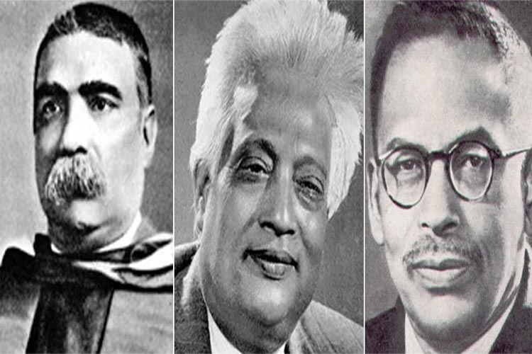 আশুতোষ মুখোপাধ্যায়, সত্যেন্দ্রনাথ বসু (বাঁ দিক থেকে) ও মেঘনাদ সাহা।- ফাইল চিত্র