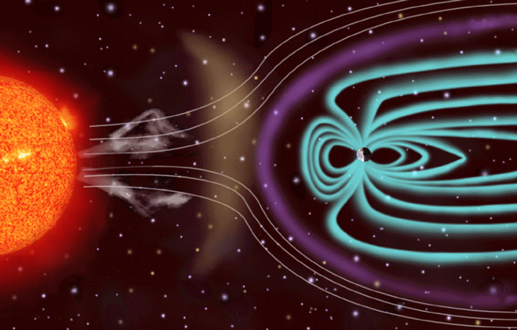 সৌরবায়ু ও সূর্যের চৌম্বক ক্ষেত্র (সবুজ রং)
