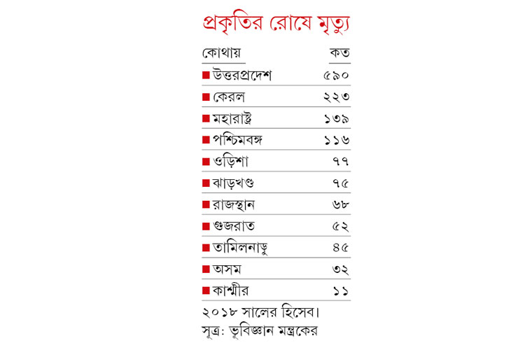 এ দিন রাজীবনের দেওয়া একটি তথ্যে দেখা যাচ্ছে, গত এক বছরে পশ্চিমবঙ্গ-সহ দেশের বিভিন্ন প্রান্তে প্রাকৃতিক দুর্যোগ হয়েছে। এবং প্রাণহানিও হয়েছে তার প্রায় প্রতিটিতেই। প্রাকৃতিক দুর্যোগ এবং প্রাণহানি, দু’টিই সব থেকে বেশি হয়েছে উত্তরপ্রদেশে। যোগী আদিত্যনাথের রাজ্যে ধুলোঝড়, বন্যা, শৈত্যপ্রবাহ, বজ্রপাত-সহ নানা প্রাকৃতিক দুর্যোগে ৫৯০ জন প্রাণ হারিয়েছেন। পশ্চিমবঙ্গে জুন থেকে সেপ্টেম্বরের মধ্যে অতিবৃষ্টি ও বন্যায় মারা গিয়েছেন ১১৬ জন।