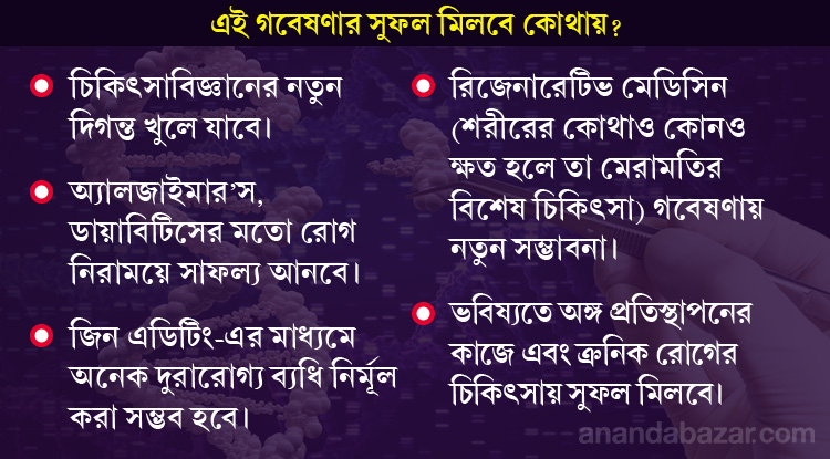 জিনতত্ত্ববিদ ইন্দ্রনীল বন্দ্যোপাধ্যায়ের কথায়, ‘‘জিন ম্যানিপুলেশনের নতুন দিগন্ত খুলে যাবে এই আবিষ্কারের মাধ্যমে। জিনগত অস্বাভাবিকতা (জেনেটিক মিউটেশন) এবং তার ফলে তৈরি হওয়া নানা রকম দুরারোগ্য ব্যাধি কেন হয় এবং তার প্রতিকার কী কী, সেই বিষয়ে একটা স্পষ্ট ধারণা তৈরি হবে। ফলে, অ্যালজাইমার’স,ডায়াবিটিসের মতো রোগ নিরাময় অনেক সহজ হয়ে যাবে।’’