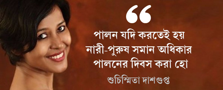 প্রতি বছর এই সময়ে নারী সংক্রান্ত শিক্ষা পাওয়া যায়। উঠে আসে নানা অভিমত। শুচিস্মিতার উল্টো পথে হাঁটলেন সেন্ট জেভিয়ার্সের অ্যাসিসট্যান্ট প্রফেসর সেঁজুতি দত্ত সোচ্চার হলেন ফেসবুকে। তাঁর মতে, ‘‘কাজের অধিকার, সমান মাইনের অধিকার এ সব ভুলে গিয়ে এই দিনটি গয়না কেনা, রেস্তোরাঁতে খাবার খাওয়া— এই সবে পরিণত হয়েছে। এ বার বলছেন সেটাও ভুলে যাও! ভুলব না। ভুলব না আমাদের ভোটের অধিকার ছিল না। ভুলব না আমাদের শিক্ষার অধিকার ছিল না। ভুলব না যে আমাদের সম্পত্তির অধিকার ছিল না। ভুলব না যে একই খাটুনি খেটে আমাদের সমান মাইনে পাওয়ার অধিকারটুকুও ছিল না। আর এও ভুলব না যে, আজ ২০১৮তে দাঁড়িয়ে এই সমস্ত কিছু এখনও প্রাসঙ্গিক এবং বাস্তব।…’’
