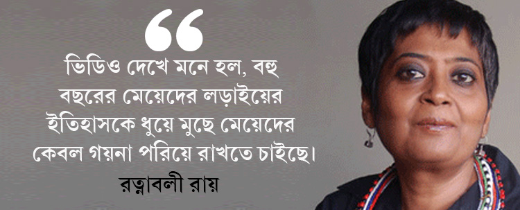 বেজায় চটেছেন ‘অঞ্জলি’-র প্রতিষ্ঠাতা রত্নাবলী রায়, “ভিডিও দেখে মনে হল, বহু বছরের মেয়েদের লড়াইয়ের ইতিহাসকে কেউ ধুয়ে মুছে সাফ করে মেয়েদের কেবল গয়না পরিয়ে রাখতে চাইছে। কী ভয়ংকর!” সাফ জবাব তাঁর।