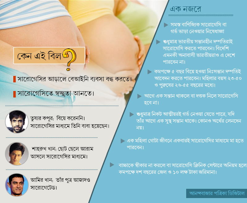 টাকার বিনিময়ে আর মাতৃজঠোর ভাড়া নেওয়া যাবে না। নিঃসন্তান দম্পতি প্রয়োজনে নিকট আত্মীয়দের মধ্যে থেকে সারোগেট মা নির্ধারণ করতে পারেন। তবে কোনও মতেই তাতে টাকার লেনদেন করা চলবে না। আর এই আইন অমান্য করলেই এক জনকে সর্বাধিক ১০ বছর পর্যন্ত জেল এবং নগদ ১০ লক্ষ টাকা পর্যন্ত জরিমানা গুনতে হতে পারে। সারোগেসির আড়ালে বেআইনি ব্যবসা রুখতে সারোগেসি নিয়ে নতুন আইন প্রণয়ন করতে চলেছে কেন্দ্র। তার আগে বুধবার সারোগেসি বিলের এই খসড়া সামনে আনল কেন্দ্রীয় সরকার। অনুমোদনের জন্য পার্লামেন্টের শীতকালীন অধিবেশনে তা পেশ করা হবে।