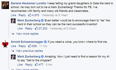 মার্কের প্রশংসায় পঞ্চমুখ প্রৌঢ়া ডারলেন হ্যাকেমের লরেটো তাঁর লেখেন, ‘‘আমি সব সময় আমার নাতনিদের বলি স্কুলে বুদ্ধিমান, পাগলাটে ছেলেদের ডেট করতে। হয়তো এক দিন সে কোনও মার্ক জুকেরবার্গ হয়ে উঠবে! ফেসবুককে ধন্যবাদ, আমি পরিবার, পুরনো বন্ধু, সহপাঠীদের সঙ্গে আবার যোগাযোগ করতে পেরেছি।’’