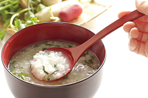 জাপানে এর নাম ওকায়ু—একেবারে আমাদের মতো সিদ্ধ ফেনা ভাত। জল তুলনায় কম, চাল একটু গোটা গোটা। সাইড ডিশ হিসাবে থাকে সব্জি ভাজা, চিকেন ভাজা, আচার (উমবশি )। আর একটা রকম আছে—নানাকসাগায়ু। বানানো খুব সহজ। সাত রকমের শাক-সব্জি দিয়ে সেভেন হার্ব্স চালের সঙ্গে সিদ্ধ হয়।