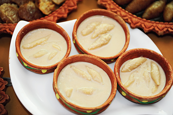 উপকরণ: ১ কাপ আতপ চাল গুঁড়ো, ১/২ কাপ ময়দা, সুজি ২ চামচ, ১ কাপ দুধ, খেজুর গুড় ১ কাপ, নুন এক চিমটে। পুরের জন্য: ১ কাপ দুধ, ১ কাপ খোয়া ক্ষীর, ১টা ছোট্ট দারচিনি গুঁড়ো, জাফরান দুধে ভেজানো, নারকেল কোরার বদলে ড্রাই ফ্রুট কুচি ও কনডেন্সড মিল্ক আধ কাপ।