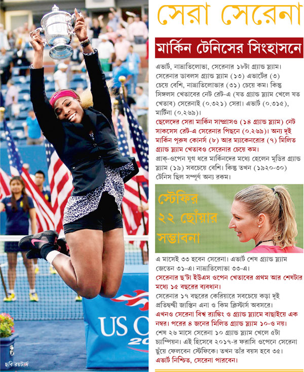 সে জন্যই কি রবিবার গভীর রাতে ফ্লাশিং মেডোর ফাইনালে সেরেনা ৬-৩, ৬-৩ ওজনিয়াকিকে হারিয়ে যুক্তরাষ্ট্র ওপেন খেতাবের হ্যাটট্রিক করার আগের দিনই ক্রিস এভার্ট আর মার্টিনা নাভ্রাতিলোভা নিউইয়র্কের জগদ্বিখ্যাত জুয়েলারি শপ ‘টিফানি’ থেকে ‘১৮’ খোদাই করা সোনার ব্রেসলেট কিনে তাঁদের যোগ্য উত্তরসূরিকে উপহার দিয়েছিলেন?
