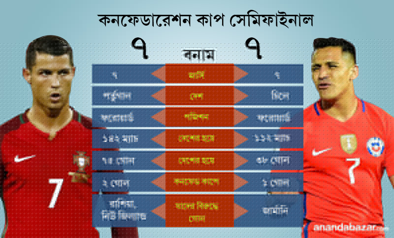 চিলে বনাম পর্তুগাল। বিশ্ব ফুটবলের ইতিহাসে এই প্রথম কোনও প্রতিযোগিতামূলক টুর্নামেন্টে মুখোমুখি হচ্ছে দুই দেশ। এর আগে যতবার দেখা হয়েছে সেটা ছিল ফ্রেন্ডলি। শেষ দু’দেশ খেলেছে ২০১১ সালে। ম্যাচ ছিল ১-১। এ বার কনফেডারেশন কাপের সেমিফাইনালে দুই দেশ। লড়াইটা তাই হাড্ডাহাড্ডি। তাও আবার দু’জনেই এই প্রথম খেলছে কনফেডারেশন কাপে। আবির্ভাবেই সেমিফাইনাল। তাই লড়াইটাও সমানে সমানে। আসল লড়াই অবশ্য দেশকে ছাপিয়ে পৌঁছে গিয়েছে ব্যাক্তিতে। লড়াইটা এ বার সাতের সঙ্গে সাতের। পর্তুগাল বনাম চিলের লড়াইয়ের মুখ হয়ে উঠেছে রোনাল্ডো বনাম স্যাঞ্চেজ। এখন বিশ্ব ফুটবলে আলোচনার তুঙ্গে তাঁরাই।