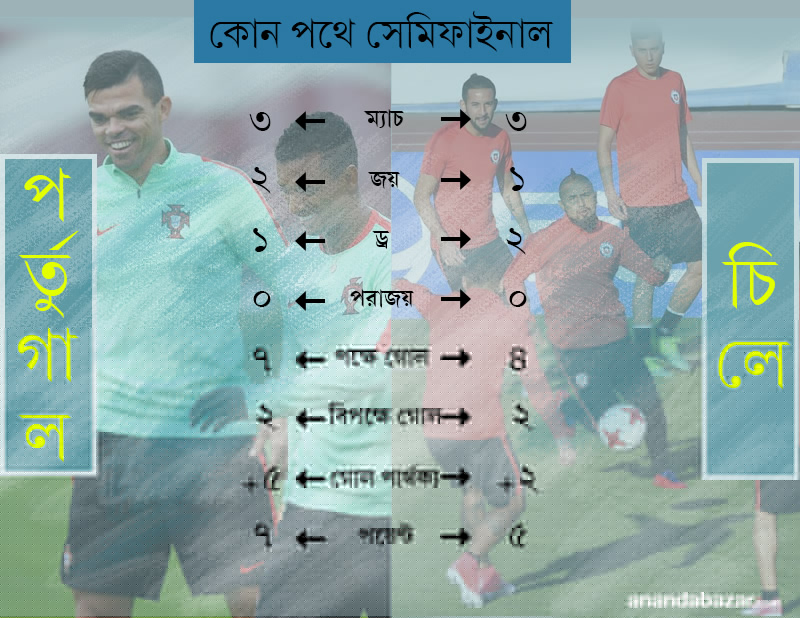 দলের গুরুত্বপূর্ণ ফুটবলার রাশিয়া ম্যাচে চোট পেয়ে ছিটকে যাওয়াটা বড় ধাক্কা পর্তুগালের জন্য। যদিও তা নিয়ে এখন আর ভাবতে রাজি নয় টিম ম্যানেজমেন্ট। পর্তুগাল দুটো জয় একটি ড্র করে সেমিফাইনালে পৌঁছলেও চিলে কিন্তু দুটো ড্র ও একটি জিতে সেমিফাইনালে পৌঁছেছে। সেদিক থেকে দেখতে গেলে একটু হলেও পিছিয়ে রয়েছে চিলে। কিন্তু সেমিফাইনাল একদম আলাদা গেম। চিলে প্রথম ম্যাচে ক্যামেরুনকে হারিয়ে দিয়েছিল ০-২ গোলে। পরের দুটো ম্যাচে জার্মানি ও অস্ট্রেলিয়ার সঙ্গে ১-১ ড্র করেছে। যেখানে তুলনা হচ্ছে রোনাল্ডো ও স্যাঞ্চেজের সেখানেও গোলের নিরিখে পিছিয়ে চিলে। রোনাল্ডোর দু’গোল হলে স্যাঞ্চেজের গোল এক। কিন্তু এই ম্যাচ পর্তুগাল বনাম চিলের থেকে অনেক বেশি হয়ে দাঁড়িয়েছে ক্রিস্টিয়ানো রোনাল্ডো বনাম অ্যালেক্সিস স্যা়ঞ্চেজের। বুধবারের রাত তাই মুখিয়ে দুই সাতের গোলমুখি লড়াই দেখার জন্য।