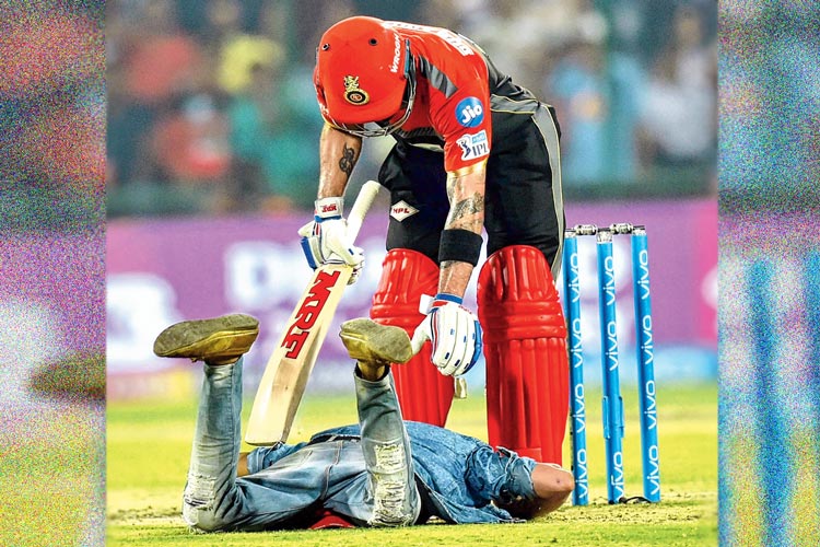 ম্যাচের মধ্যে মাঠে নেমে ভক্তের প্রণাম ও নিজস্বী।