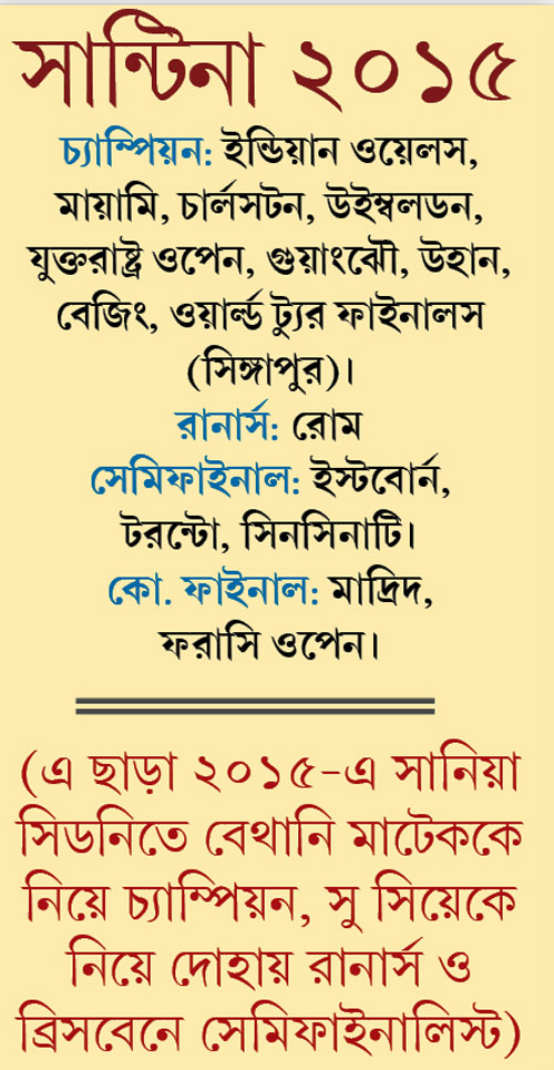 দু’হাজার পনেরোর সানিয়ার মতো একটা গোটা মরসুম টানা এত ভাল ডাবলস খেলতে আমি লিয়েন্ডার বা মহেশকেও দেখেছি বলে মনে করতে পারছি না! এমনকী নিরানব্বইয়ে লি-হেশ জুটি যে বার চারটেই গ্র্যান্ড স্ল্যাম ডাবলস ফাইনালের পাশাপাশি এটিপি ওয়ার্ল্ড ট্যুর ফাইনালসেরও ফাইনাল খেলেছিল, সে বছরেও ওরা তিন-চারটের বেশি ট্রফি কিন্তু জিততে পারেনি। সেখানে সানিয়া এ বছর দশটা টুর্নামেন্ট চ্যাম্পিয়ন। তার মধ্যে ন’টা হিঙ্গিসের সঙ্গে।