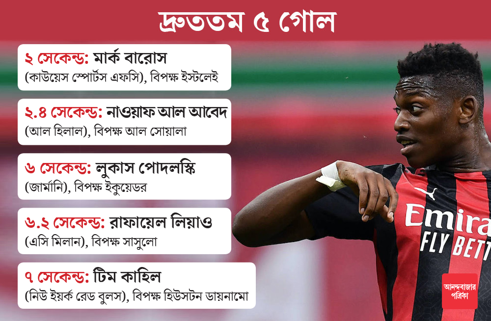 অবিশ্বাস্য রেকর্ড করলেন এসি মিলানের রাফায়েল লিয়াও। মাত্র ৬ সেকেন্ডে গোল করলেন তিনি। ইতালির সিরি এ ফুটবল লিগের ইতিহাসে এটি দ্রুততম গোল। ক্লাব ও আন্তর্জাতিক ফুটবল মিলিয়ে এটি চতুর্থ দ্রুততম গোল।