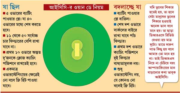 প্রথম দশ ওভারে ক্যাচিং পজিশনে দুই ফিল্ডার বাধ্যতামূলক নয়: ভালই হল। ক্যাপ্টেনরা আরও ছড়িয়ে ফিল্ড সাজাতে পারবে। প্রথম থেকে ব্যাটসম্যানরাও অতটা চালাতে পারবে না। ব্যাট-বলের লড়াইটা তাই আরও জমবে।