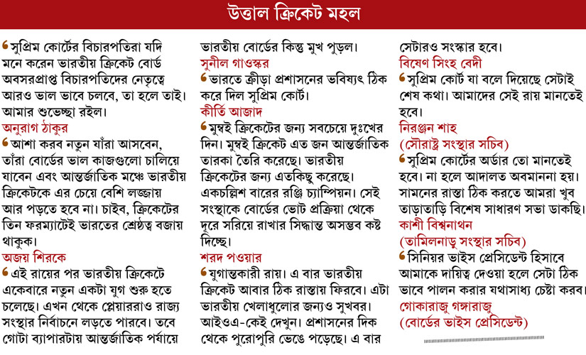 প্রথমেই বোর্ড ও রাজ্য ক্রিকেট প্রশাসন থেকে সেই সব কর্তাদের সরে যেতে হবে, বিচারপতি লোঢা কমিটির সুপারিশ অনুযায়ী যাদের ক্রিকেট প্রশাসনে থাকার যোগ্যতা নেই। এবং আদালতের নির্দেশ অনুযায়ী সোমবার থেকেই তারা বাতিলের খাতায় চলে গিয়েছে। রায়ের ১৫ নম্বর পাতায় এটা স্পষ্ট করে বলে দেওয়া হয়েছে। প্রত্যেকটা রাজ্য সংস্থাকেও তাই এখনই পরিবর্তন শুরু করতে হবে।