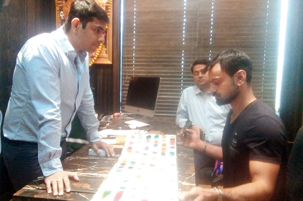 শাড়ির দোকানে ডিজাইনে ডুব মহম্মদ হাফিজের। —নিজস্ব চিত্র।