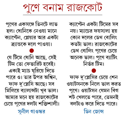 পুণের অধিনায়ক কে, সেটা নিয়ে জল্পনা অর্থহীন। ওটা ধোনিই হচ্ছেন। বরং প্রশ্ন হল, টিমের কোচ কে হবেন? এ দিন ড্রাফটিং শেষে সাংবাদিক সম্মেলন করতে এসে পুণে প্রতিনিধি তথা আটলেটিকো দে কলকাতা সচিব সুব্রত তালুকদার বলে দেন, ‘‘আমরা যাদের নেওয়ার প্ল্যান করেছিলাম, সবাইকে পেয়েছি। আমরা নতুন ফ্র্যাঞ্চাইজি। আমাদের ব্র্যান্ড তৈরি করতে হবে। তার জন্য ধোনির চেয়ে ভাল আর কে হতে পারত?’’ সঙ্গে তিনি যোগ করেন, ‘‘টিমের নাম আর লোগো আগামী সপ্তাহে ঘোষণা করা হবে। আর আমরা ইতিমধ্যে দু’জনের সঙ্গে কথা বলছি যাঁরা কোচ হিসেবে দাবিদার।’’ শোনা যাচ্ছে, নাম দু’টো গ্যারি কার্স্টেন এবং স্টিভন ফ্লেমিং।