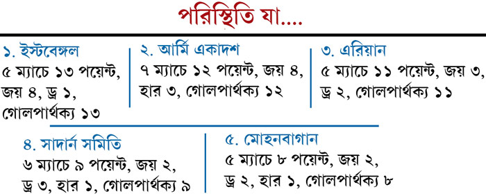 আর বিদেশিহীন আর্মি একাদশের কাছে হেরে কলকাতা লিগ জয়ের কক্ষপথ থেকে বহু যোজন দূরে সরে যাওয়া বাগান কোচ সঞ্জয় সেন কী বলছেন? ‘‘আই লিগেও তো দু’টো ম্যাচ হেরেছিলাম। আজ ছেলেরা কথা দিয়েছে পরের পাঁচটা ম্যাচ জিতে টিমকে চ্যাম্পিয়নশিপের লড়াইতে রাখবে।’’ মুখে এ কথা বললেও আই লিগ জয়ী সঞ্জয় হয়তো বুঝছেন, পাঁচ বছর পর সবুজ-মেরুন তাঁবুতে কলকাতা লিগ আনতে গেলে পরের পাঁচটা ম্যাচ জেতার পরেও অসংখ্য যদি এবং কিন্তুর উপর নির্ভর করতে হবে। তাকিয়ে থাকতে হবে চিরপ্রতিদ্বন্দ্বীর শেষ পাঁচটা ম্যাচের দিকে। আর্মি, এরিয়ান, টালিগঞ্জ, মহমেডানের বাঁধা টপকে যাওয়া ইস্টবেঙ্গল সেই সুযোগ সঞ্জয়কে দিলে তা সাম্প্রতিককালের বৃহত্তম ময়দানি অঘটন হবে!