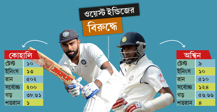 অবশ্য ওয়েস্ট ইন্ডিজের বিরুদ্ধে টেস্টে তিনটি অর্ধশতরান রয়েছে তাঁর। অশ্বিনের আবার একটিও পঞ্চাশ নেই। ওয়েস্ট ইন্ডিজের বিরুদ্ধে কোহালির সর্বাধিক রান হল ২০০। অশ্বিন এটাতেও পিছিয়ে। তাঁর সর্বাধিক রান হল ১২৪। তবে মোট রান, গড় ও শতরানের সংখ্যায় কোহালিকে পিছনে ফেলেছেন অশ্বিন।