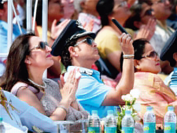 বিমানবাহিনী দিবস প্যারেডের ভিডিও মোবাইল-বন্দি করতে ব্যস্ত সাম্মানিক গ্রুপ ক্যাপ্টেন সচিন তেন্ডুলকর। (বাঁ দিকে) গ্রুপ ক্যাপ্টেনের সঙ্গে হাত মেলাতে এলেন স্বয়ং এয়ার চিফ মার্শাল অরূপ রাহা। বৃহস্পতিবার গাজিয়াবাদের হিন্দন বিমানঘাঁটিতে।