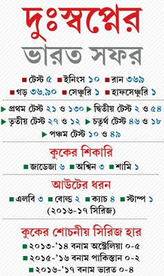 আসলে গত অক্টোবরে বাংলাদেশে প্রথম টেস্ট হারের পরেই কুকের শেষের সলতেটা পাকানো শুরু হয়ে যায়। ওর একমাত্র সুযোগ ছিল ভারত সফর থেকে ভাল কিছু করে নিজের অধিনায়কত্ব বাঁচানো। আর সেটাতেই কুক হেরে বসল ০-৪।
