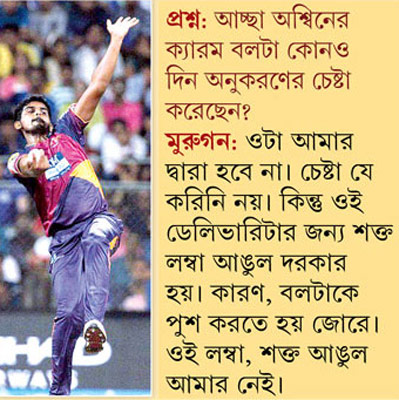 মুরুগন: ওটা আমার দ্বারা হবে না। চেষ্টা যে করিনি নয়। কিন্তু ওই ডেলিভারিটার জন্য শক্ত লম্বা আঙুল দরকার হয়। কারণ, বলটাকে পুশ করতে হয় জোরে। ওই লম্বা, শক্ত আঙুল আমার নেই।