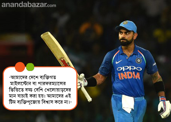 বিরাট: আনন্দ-হতাশা মিশিয়ে দু’টো দিকই থাকে। যখন টিম ভাল করে, তখন সবাই অধিনায়কের প্রশংসা করে। আমি মনে করি সেটাও ঠিক নয়। আমার মনে হয় সাফল্য আসে টিমের মিলিত পরিশ্রমের জন্য। একা অধিনায়ককে কৃতিত্ব দেওয়াটা কখনও আমি সমর্থন করি না। আমাদের টিমের মধ্যে সেই স্পিরিটেই কিন্তু আলোচনা হয়। ব্যাপারটা কখনওই ব্যক্তি নির্ভর নয়, দলগত। কিন্তু অধিনায়ককে যে জায়গায় সাহস দেখাতে হয়, তা হচ্ছে টিম যখন ভাল না করে। তখন বেশির ভাগ দায়টাই গিয়ে বর্তায় এক জনের উপর— অধিনায়ক। আর এটা তো ঠিকই যে, সমালোচনা করার জন্য লোকে তৈরি হয়ে বসে আছে। সুযোগ পেলেই হল।