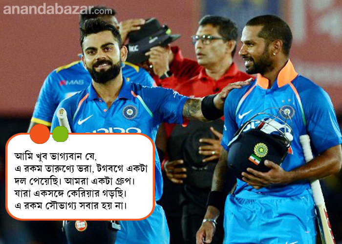 বিরাট: আমি তুলনায় যেতে চাই না। প্রত্যেকের পরিস্থিতি প্রত্যেকের চেয়ে আলাদা। তাই তুলনা করাটা ঠিক হবে না। ওই যে বললাম, আমি ভাগ্যবান সমবয়সি অনেকের সঙ্গে একসঙ্গে খেলতে পারছি। এর ফলে আমাদের সামনে বন্ধু হিসেবে খেলার সুযোগ এসে গিয়েছে। এই টিমে বেশির ভাগ ছেলের সঙ্গেই আমি যে ভাবে মিশি, বাড়ি গিয়ে নিজের পুরনো বন্ধুদের সঙ্গেও সে রকমই সম্পর্ক। স্বভাবগত দিক থেকেও আমি এ রকমই। বন্ধুদের সঙ্গে খোলামেলা ভাবে মিশতে ভালবাসি, যেটা মনে আসে সেটাই বলি, সকলের সঙ্গে মিলেমিশে থাকতে পছন্দ করি। আমি যখন সতীর্থদের সঙ্গে থাকি, কখনও ভাবি না যে, ওহ্ আমি তো টিমের ক্যাপ্টেন। তাই আমাকে নির্দিষ্ট একটা ভঙ্গিতেই চলতে হবে বা এটা আমার করা শোভা পায় না। যেখানে ক্যাপ্টেন্সি দরকার, সেখানে আমি ক্যাপ্টেন। না হলে সতীর্থদের কাছে আমি ওদের এক জন নর্ম্যাল বন্ধু। আর আমাদের দলেও সকলের মনোভাব এতটাই বন্ধুত্বপূর্ণ যে, খোলামেলা পরিবেশটাও খুব তাড়াতাড়ি গড়ে উঠেছে। একে অন্যের সান্নিধ্যে আমরা উষ্ণতা অনুভব করি, খুব সহজাত ভাবেই সেটা ঘটে। কাউকে জোর করে এই পারস্পরিক ভাল লাগাটা তৈরি করতে হচ্ছে না।