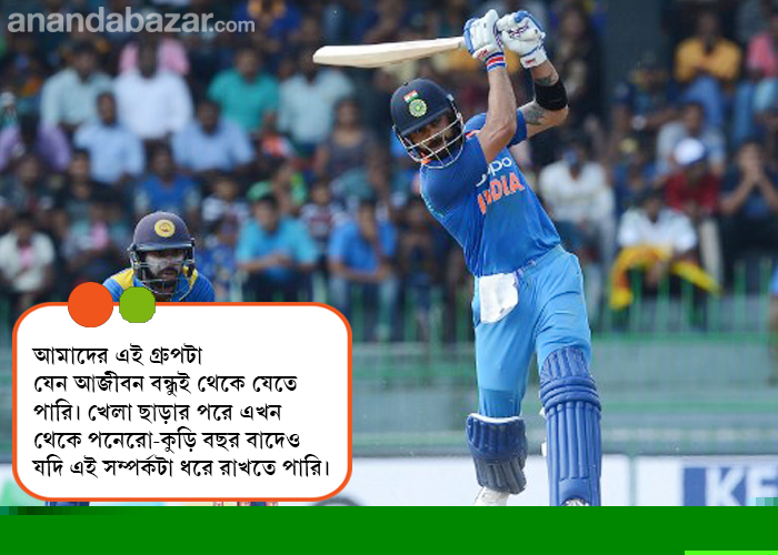 বিরাট: মাঠের মধ্যে জয় করার পাশাপাশি মাঠের বাইরেও আমাদের একটা লক্ষ্য আছে। আমাদের এই গ্রুপটা যেন আজীবন বন্ধুই থেকে যেতে পারি। খেলা ছাড়ার পরে এখন থেকে পনেরো-কুড়ি বছর বাদেও যদি এই সম্পর্কটা ধরে রাখতে পারি, তা হলে সেটা সেরা প্রাপ্তি হিসেবে থেকে যাবে। আমরা সকলেই সেটা করতে চাই। কিছু ব্যক্তি ক্রিকেট খেলার জন্য একজোট হয়েছিল আর কয়েক বছর ধরে তারা একসঙ্গে একটি দলের হয়ে খেলেছিল, এ রকম হয়ে থাকতে চাই না। আমরা হতে চাই এক দল বন্ধু, যারা একসঙ্গে মাঠে খেলতে নেমেছিল। দু’টোর মধ্যে অনেক, অনেক তফাত।