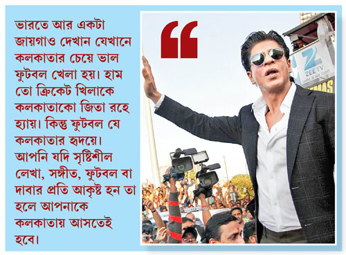 শাহরুখ: ভারতে আর একটা জায়গাও দেখান যেখানে কলকাতার চেয়ে ভাল ফুটবল খেলা হয়। হাম তো ক্রিকেট খিলাকে কলকাতাকো জিতা রহে হ্যায়। কিন্তু ফুটবল যে কলকাতার হৃদয়ে। আপনি যদি সৃষ্টিশীল লেখা, সঙ্গীত, ফুটবল বা দাবার প্রতি আকৃষ্ট হন তা হলে আপনাকে কলকাতায় আসতেই হবে।