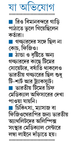 অনির্বাণ যা শুনিয়েছেন সেগুলো এই রকম। তিনি রিও পৌঁছচ্ছেন জানার পরেও বিমানবন্দরে গাড়ি পাঠাতে ভুলে গিয়েছিলেন কর্তারা। ট্যাক্সি নিয়ে গেমস ভিলেজ পৌঁছে ঢোকার অনুমতি পাননি টিমের সরকারি গাড়িতে আসেননি বলে। অন্য দেশের গল্ফারদের সঙ্গে কোচ, সহকারী কোচ এবং ফিজিও ছিল। অনির্বাণ বলেছেন, ‘‘আমাদের টিমে শুধু আমি আর শিবশঙ্কর প্রসাদ চৌরাসিয়া আর আমাদের ক্যাডিরা। কোচই নেই, তার আবার ফিজিও।’’ বৃষ্টি আর রিওর বারো-তেরো ডিগ্রি ঠান্ডায় অন্য গল্ফারদের কাছে জাতীয় দলের সোয়েটার, বর্ষাতি থাকলেও ভারতের দুই গল্ফারের ছিল শুধু টি-শার্ট আর ট্র্যাক-টপ। ‘‘ঠান্ডায় ঠকঠক কাঁপতে কাঁপতে ভেজা জামাতেই খেলেছি আমরা। অলিম্পিক্সে নিজের জিনিস পরা যায় না। দেশেটা পরতে হয়। খুব লজ্জা করেছিল।’’