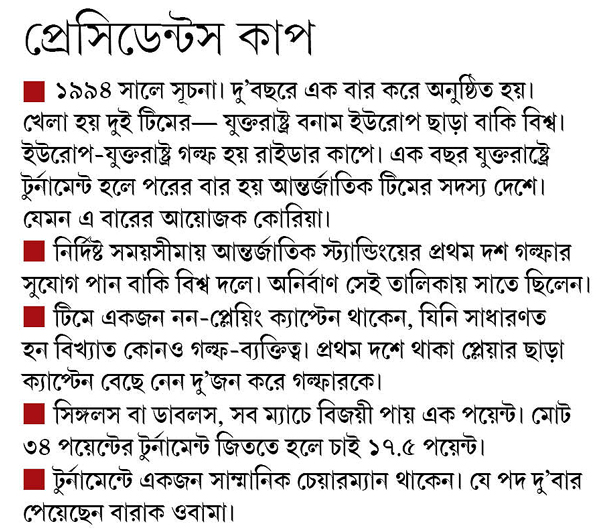 ১৯৯৪ সালে প্রেসিডেন্টস কাপের সূচনা। ঐতিহাসিক ভাবে এটা দুটো দলের লড়াই— মার্কিন যুক্তরাষ্ট্র এবং ইউরোপ ছাড়া বাকি বিশ্ব। ইউরোপের সঙ্গে যুক্তরাষ্ট্রের গল্ফ-যুদ্ধ রাইডার কাপের জন্য তুলে রাখা হয়। দু’বছরে এক বার বসে প্রেসিডেন্টস কাপের আসর। এক বছর যুক্তরাষ্ট্রে, পরের বার আন্তর্জাতিক টিমের সদস্য দেশে। এ বারের টুর্নামেন্ট অক্টোবরে অনুষ্ঠিত হবে কোরিয়ায়।