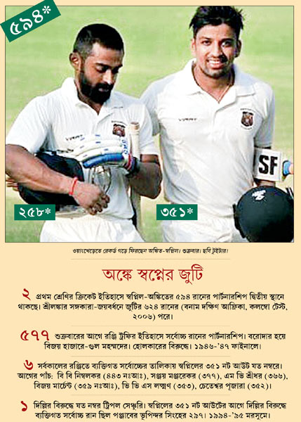 সন্ধেয় একা অপরাজিত ৩৫১ করা মহারাষ্ট্র অধিনায়ক স্বপ্নিল গুগালে বলছিলেন যে, খেলার সময় কোনও রেকর্ডের কথা তাঁদের মাথায় ছিল না। ‘‘আমি আর অঙ্কিত বলাবলি করছিলাম যে, উইকেটে থেকে যেতে হবে। ব্যাট করতে এখন সুবিধে হচ্ছে। যতটা পারব, রান তুলে রাখব।’’ বলে-টলে বীরেন্দ্র সহবাগের অন্ধভক্তের সহাস্য সংযোজন, ‘‘প্রথম দিকে বীরু পাজির মতো মারব ঠিক করেছিলাম। পরে অঙ্কিত বলল, শান্ত থাক। ওর সঙ্গে ব্যাট করার এটাই সুবিধে। ধৈর্য ব্যাপারটা চলে আসে। এ সব ইনিংসে ধৈর্য রাখাটাই আসল। সত্যি বলতে আমরা জানতামও না কী রেকর্ড করেছি, না করেছি! পরে এসে শুনলাম সব।’’ তাঁর পার্টনার অঙ্কিত, ঘরোয়া ক্রিকেটে ‘ক্রাইসিস ম্যান’ হিসেবে যাঁকে ডাকা হয় তিনিও ফোনে বললেন, ‘‘শুনলাম সঙ্গকারাদের রেকর্ডের ব্যাপারটা। সত্যি, বাজে মিস হয়ে গেল। ডিক্লেয়ার না করলে আমরা ওটা টপকে যেতে পারতাম হয়তো। খারাপ তো লাগছেই। যাক গে, যা করেছি সেটাও কম কী?’’