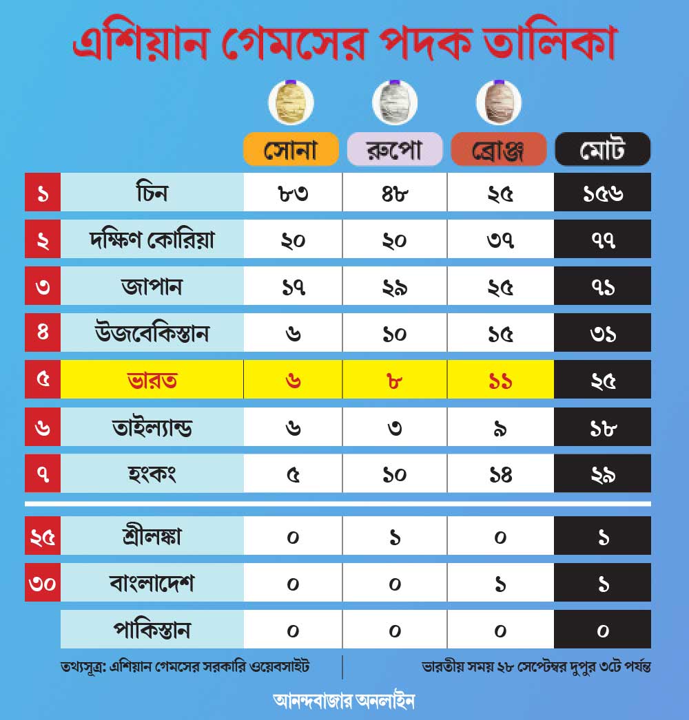 বৃহস্পতিবার দিনের শুরুতেই এশিয়ান গেমসে সোনা জেতে ভারত। পুরুষদের ১০ মিটার এয়ার পিস্তল ইভেন্টে সোনা জেতেন ভারতের সরবজ্যোৎ সিংহ, শিবা নারওয়াল ও অর্জুন সিংহ চিমা। তাঁরা মোট ১৭৩৪ পয়েন্ট স্কোর করেছেন। অনুশের জয়ের পর এশিয়ান গেমসে ভারতের পদকের সংখ্যা হল ২৫। তার মধ্যে ৬টি সোনা, ৮টি রুপো ও ১১টি ব্রোঞ্জ রয়েছে।