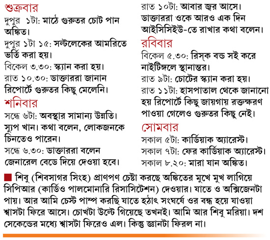 শুক্রবার দুপুর! ঘড়ির কাঁটায় তখন একটা বাজতে মিনিট পাঁচেক বাকি। শিবু (শিবসাগর সিংহ) প্রাণপণ চেষ্টা করছে অঙ্কিতের মুখে মুখ লাগিয়ে সিপিআর (কার্ডিও পালমোনারি রিসাসিটেশন) দেওয়ার। যাতে ও অক্সিজেনটা পায়। আর আমি চেস্ট পাম্প করছি যাতে হঠাৎ সংঘর্ষে ওর বন্ধ হয়ে যাওয়া শ্বাসটা ফিরে আসে। চোখটা উল্টে গিয়েছে তখনই। আমি আর শিবু মরিয়া। দশ সেকেন্ডের মধ্যে শ্বাসটা ফিরেও এল। কিন্তু জ্ঞানটা ফিরল না। ততক্ষণে মাঠে ঢুকে পড়েছেন ডাক্তার। অঙ্কিতের পালসটা একবার দেখলেন। তার পরেই অ্যাম্বুল্যান্স ডাকলেন ওকে দ্রুত হাসপাতালে নিয়ে যাওয়ার জন্য। তখনই অঙ্কিতকে অ্যাম্বুল্যান্সে তুলে হাসপাতালে ছুটলেন আমাদের ক্লাবের শ্যামলদা (গুপ্ত)।