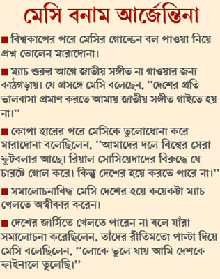ফুটবল দুনিয়া এবং সোশ্যাল মিডিয়ায় আরও যে ব্যাপারটা নিয়ে ঝড় উঠেছে, তা হল, মেসিকে এ ভাবে অপমানিত হতে হল কি না আর্জেন্তিনাবাসীর কাছেই। তা সে যতই রিভারপ্লেটের ফ্যান হোক না কেন। এর আগেও দেশ বনাম ক্লাব বিতর্কে জড়িয়ে পড়েছেন মেসি। মারাদোনার মতো কিংবদন্তিও বলেছিলেন, মেসি দেশের হয়ে খেলতে ততটা উৎসাহ বোধ করেন না। মাঝে এও শোনা যাচ্ছিল, মেসি নাকি অভিমানে দেশের জার্সি বেশ কিছু দিন গায়ে তুলতে নাও পারেন।