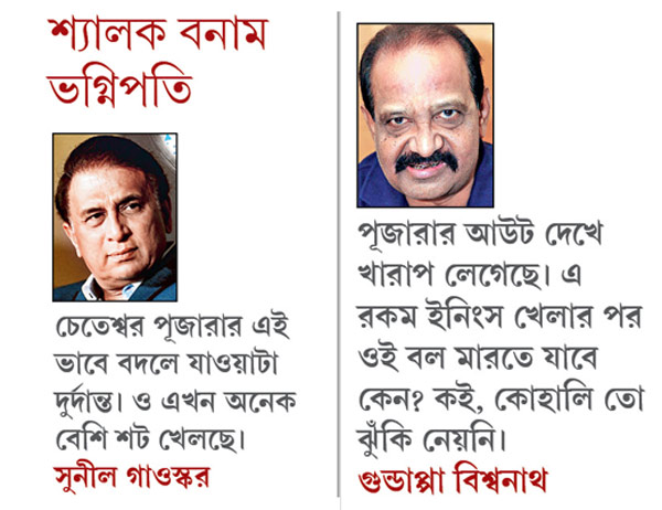 এমনকী সুদূর বেঙ্গালুরুতে বসে বিরাট ও পূজারার পার্টনারশিপ দেখা তাঁদের এক গুণমুগ্ধ কিংবদন্তিও। ভারতীয় দলের ব্যাটিং অর্ডারে এই জায়গায় তিনিও এককালে নামতেন যে। তিনি গুন্ডাপ্পা বিশ্বনাথ। বিরাট-পূজারার মতো টেকনিকে নিখুঁত ব্যাটসম্যানদেরই যে এই জায়গায় ব্যাট করা উচিত, তা জানিয়ে বিশ্বনাথ এ দিন বাড়ি থেকে ফোনে বলেন, ‘‘আমি জানি ওরা দু’জনেই দুর্দান্ত ব্যাটসম্যান। ওদের এটাই জায়গা। কিন্তু ওদের বোঝাপড়ার এত অভাব আর পূজারার আউট দেখে কিন্তু আমার খুব খারাপ লেগেছে। পূজারা এ রকম একটা ইনিংস খেলার পর ওই বল মারতে যাবেই বা কেন? কোথায়, কোহালি তো ঝুঁকি নেয়নি।’’