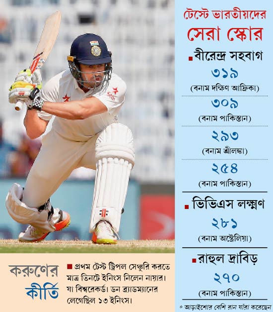 ভাবতে পারেন, যে বছর রঞ্জিতে ওর অভিষেক হল, সে বছরই রঞ্জি ফাইনালে তিনশো করেছিল করুণ! শুধু তাই নয়, ছয় মেরে টিমকে ট্রফি জিতিয়েছে। পনেরো বছর যে ট্রফিটা কর্নাটকের অধরা ছিল। আবার এটাই ওর অভিষেক টেস্ট সিরিজ। আর সেখানেই কি না একেবারে তিনশো!