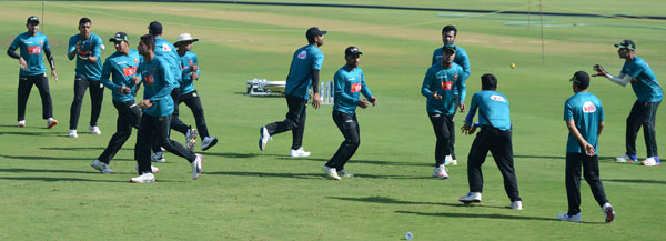 ভারতের বিরুদ্ধে খেলতে নামার আগে অনুশীলনে বাংলাদেশ। ছবি: এএফপি।