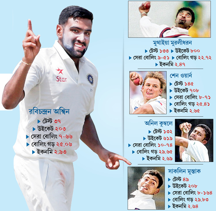 আর তাই, আমি ওকে লেজেন্ডদের ক্লাবে দেখতেও পাচ্ছি। স্পিন লেজেন্ডদের ক্লাবে। যে ক্লাবে মুরলীধরন, শেন ওয়ার্ন, কুম্বলে, সাকি-ভাইরা আছে। আমার মনে হয়, খুব বেশি দিন অপেক্ষা করতেও হবে না। কয়েকটা বছর যাক। আরও কিছু টেস্ট খেলুক। লোকে এমনিই বুঝে যাবে, কেন কথাটা বলছি। আমাকে বলতে হবে না। দুনিয়াই তখন চোখ বুজে মুরলীধরনদের ব্র্যাকেটে অশ্বিনকে রাখবে।...”